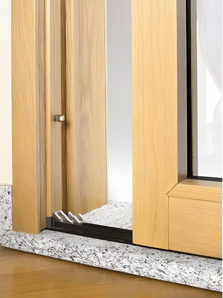 Il binario inferiore è in acciaio, spesso 12 x 12 millimetri, con un rivestimento in alluminio e battute laterali tra ante mobili e fisse in acciaio rivestito in legno. La finestra presenta una serratura con chiave di blocco sul lato interno. Un maniglione aziona un sistema di quattro ruote inferiori “alzante scorrevole” ed aggancia tre catenacci in acciaio “frontali” più chiusura inferiore, i quali assicurano l’antistrappo da tentativi di effrazione.