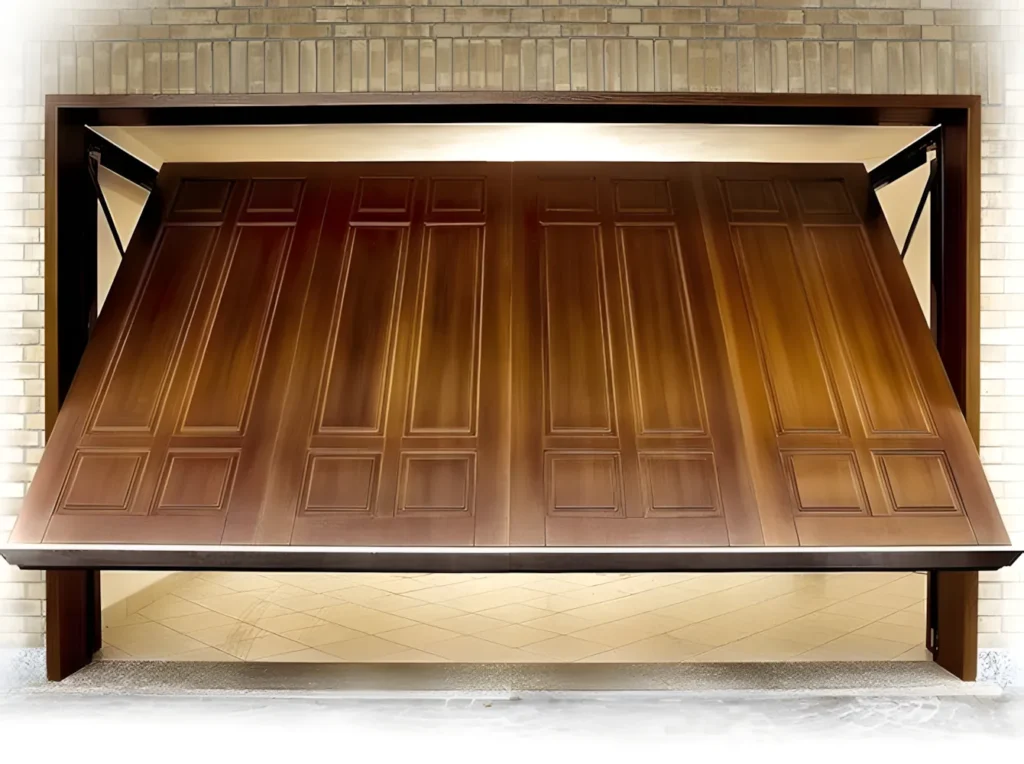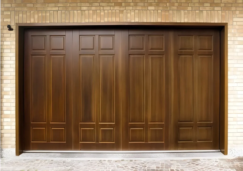 L’anta viene movimentata tramite automazione radiocomandata ed accessori standard (norme UNI 8612). Il sistema di “blocco” (da utilizzare per lunghi periodi di assenza) con serratura di sicurezza aziona i catenacci in acciaio di chiusura e disinserisce la linea di alimentazione dei motori tramite microinterruttore, per impedire l’accidentale apertura con radiocomando. Il rivestimento esterno viene effettuato con diverse essenze di legno.