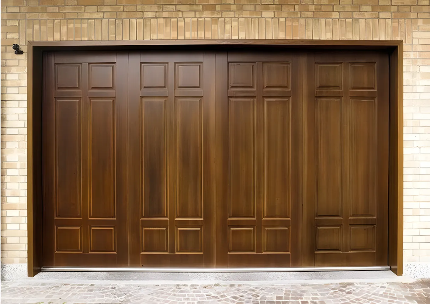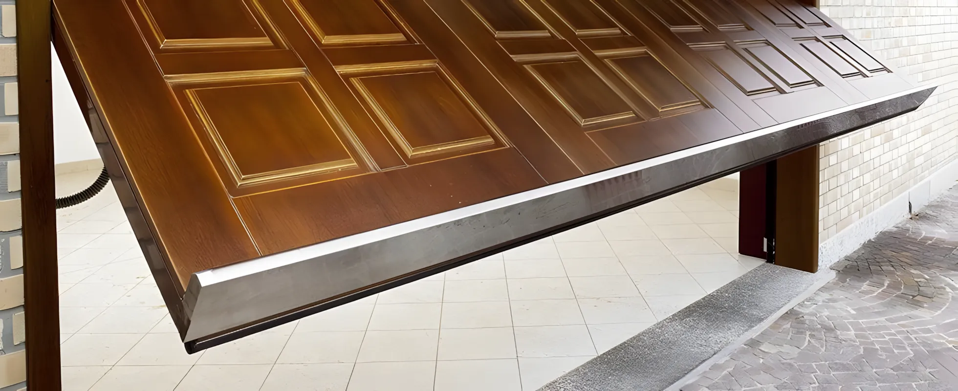 L’anta viene movimentata tramite automazione radiocomandata ed accessori standard (norme UNI 8612). Il sistema di “blocco” (da utilizzare per lunghi periodi di assenza) con serratura di sicurezza aziona i catenacci in acciaio di chiusura e disinserisce la linea di alimentazione dei motori tramite microinterruttore, per impedire l’accidentale apertura con radiocomando. Il rivestimento esterno viene effettuato con diverse essenze di legno.