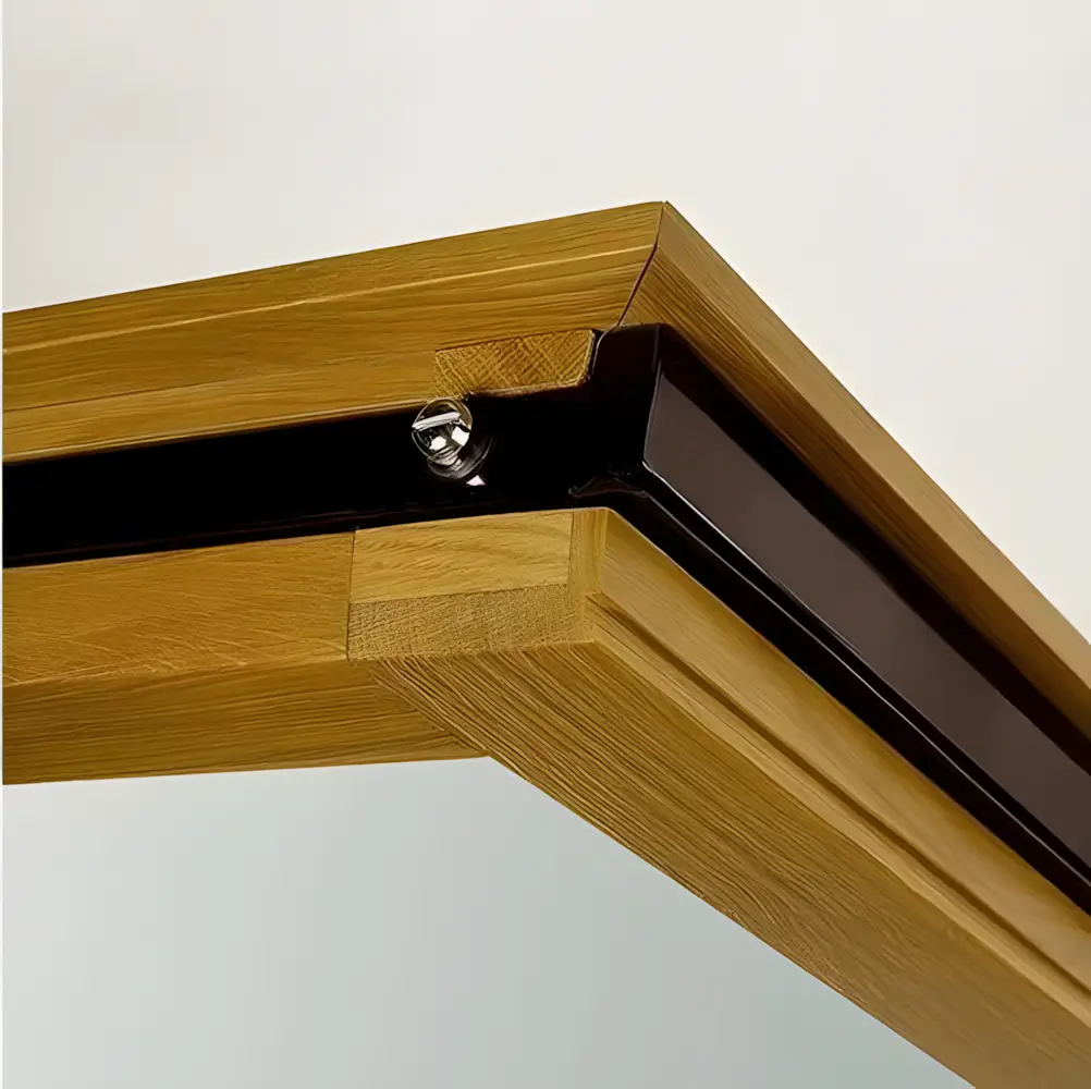 Questa finestra termoacustica blindata è caratterizzata da una doppia guarnizione ed è realizzata su misura in materiale acciaio verniciato a forno, a 180°, con polvere poliestere. L’infisso è completamente rivestito in legno massiccio di 15 millimetri per lato, avvitato in ogni sua parte, per uno spessore complessivo di 82 millimetri. Il trattamento delle parti in legno viene effettuato con tinta noce antimuffa e antitarlo impregnante, più due mani di fondo e verniciatura per esterno all’acqua o tinta RAL.